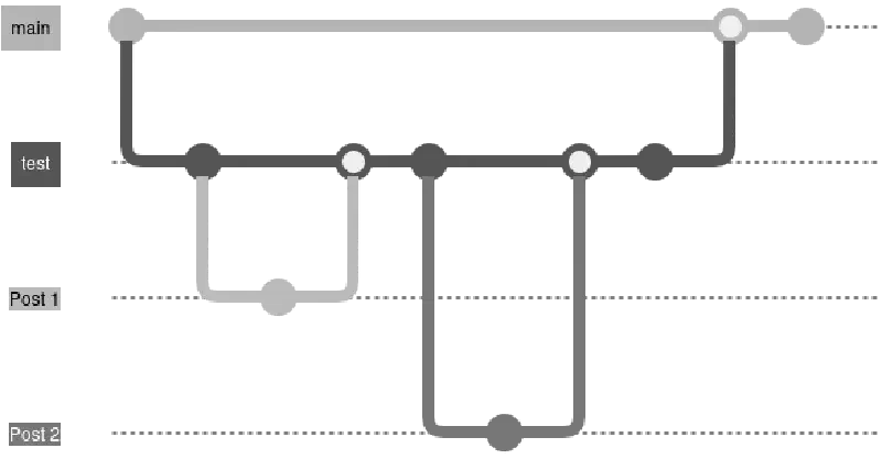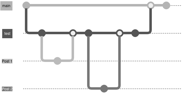 I would branch off from test into feature branches, creating a new branch for each post or change to the site.